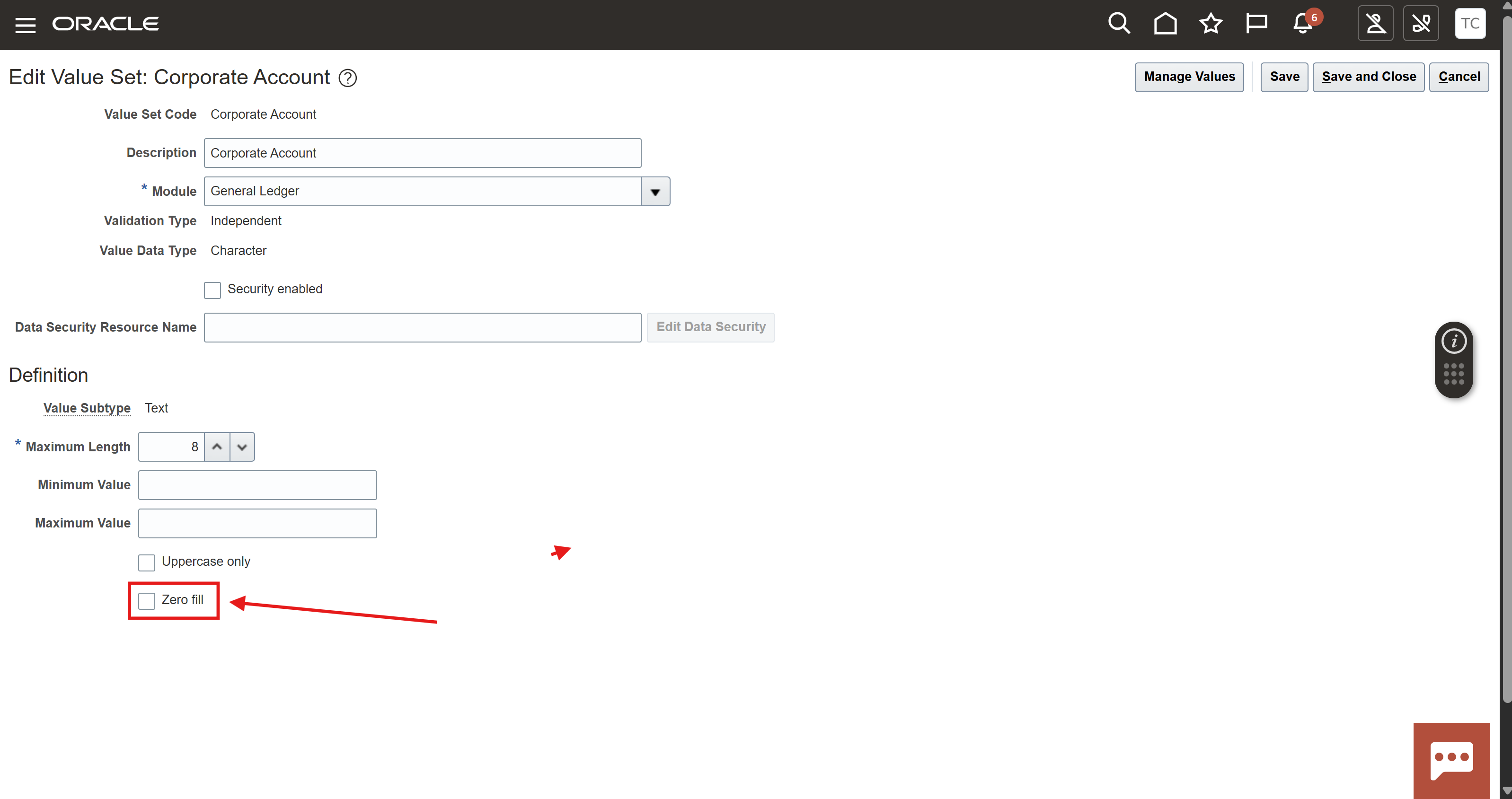 Dear Gopal, you can go to Setup and Maintenance > "Financials" work area (upper left dropdown) > Search "Manage Chart of Accounts Value Sets" > Search for your Value Set (for example, you can search the seeded "Corporate Account") > Select the Value Set > Click on Edit (Pencil-like icon) > In the lower area you can see "Zero fill"