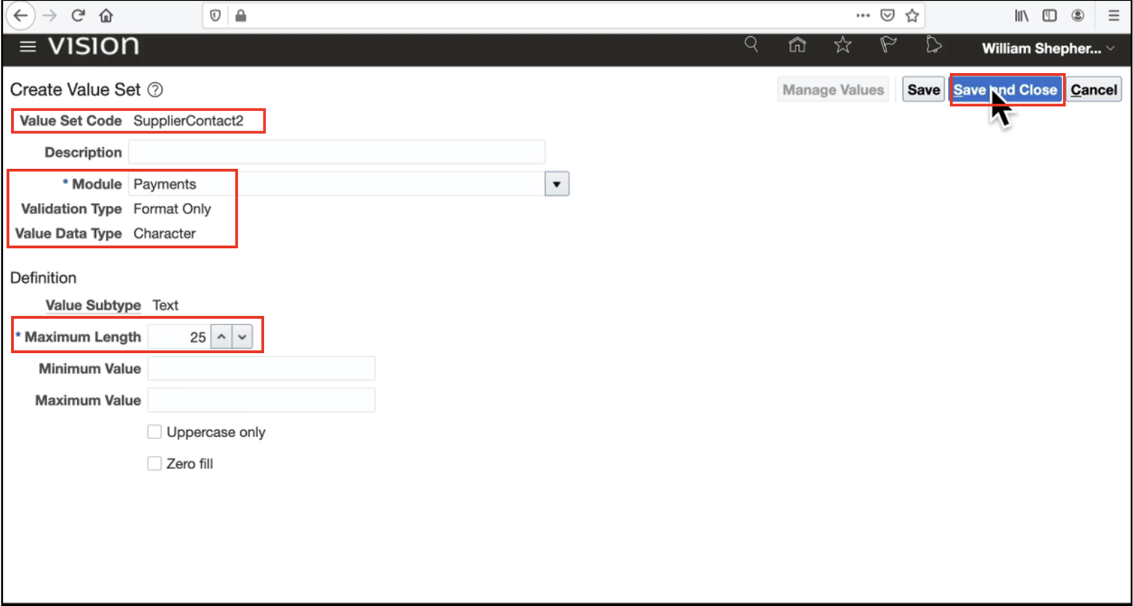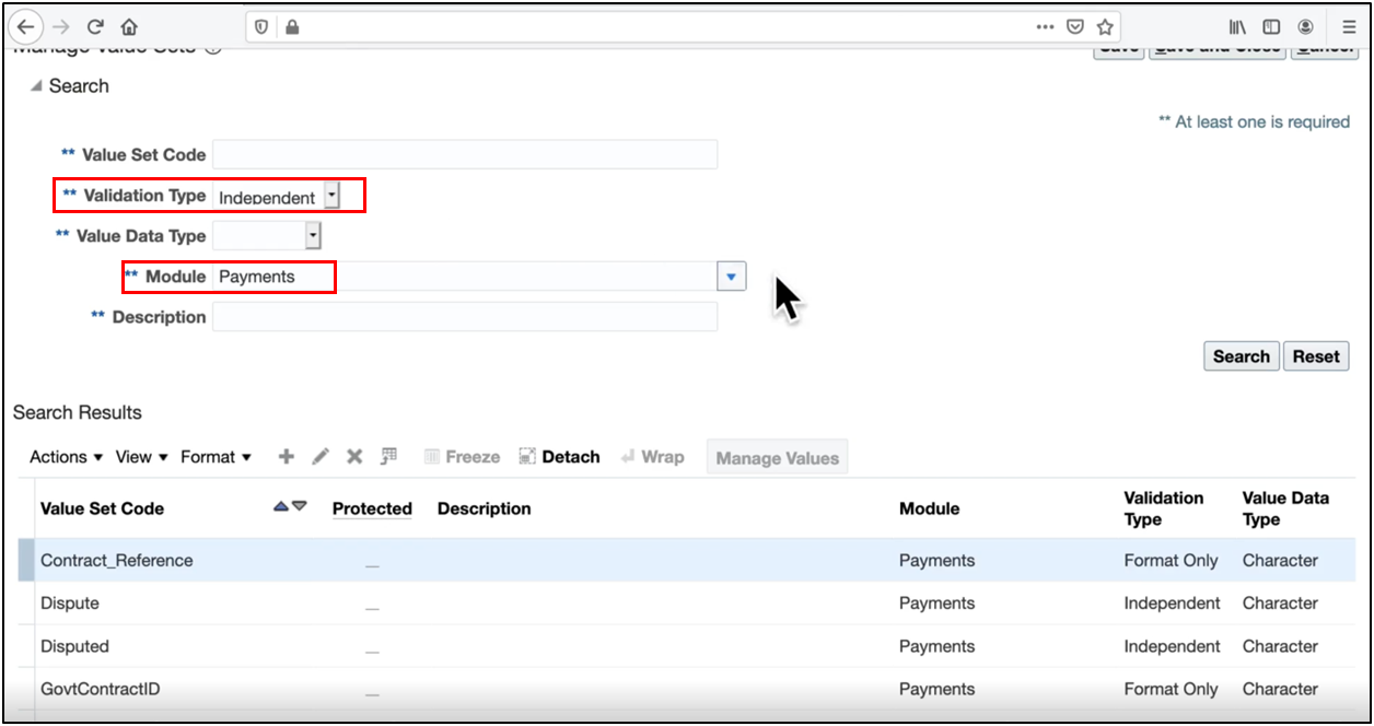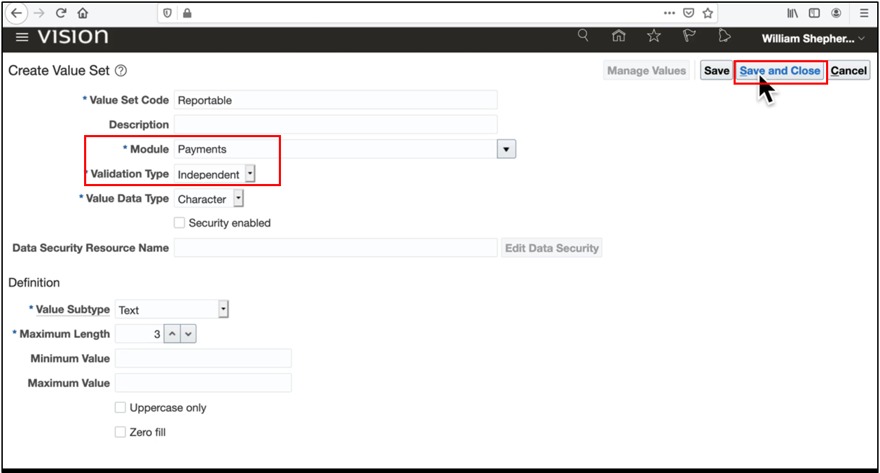 4. Click Create Value Set, provide a Value Set Code, and select Payments as the Module.