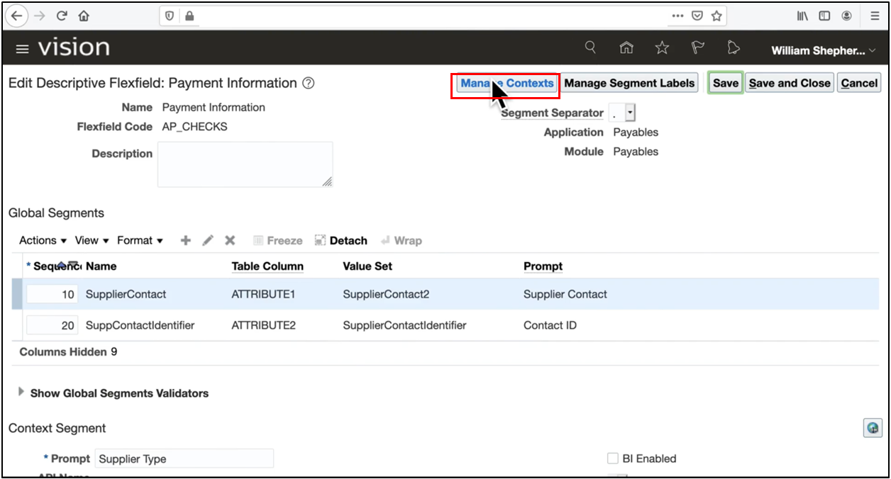 Click Manage Contexts to create and maintain context values in Oracle Fusion Descriptive Flexfields