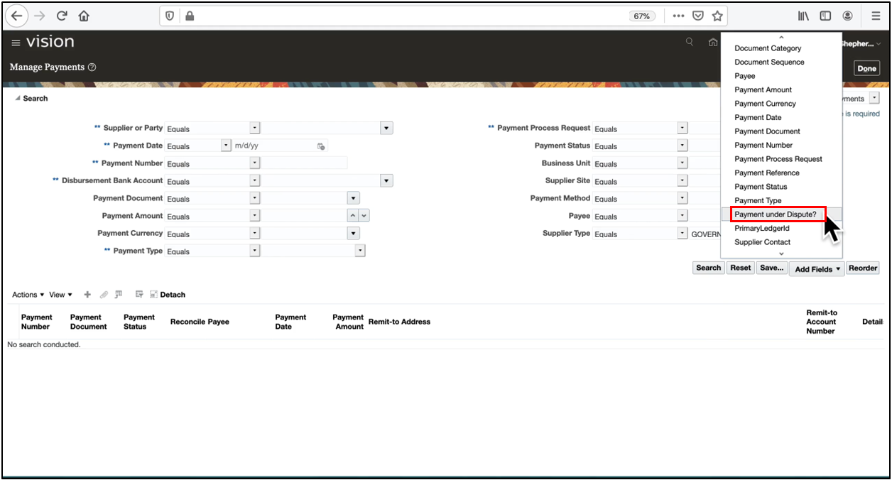 3. Add fields related to descriptive flex field attributes (for example, Payment Under Dispute or Import Reference Number)