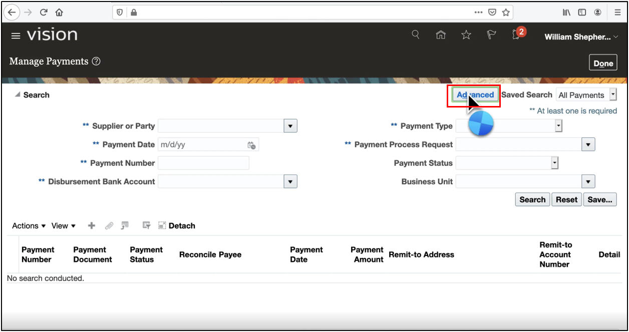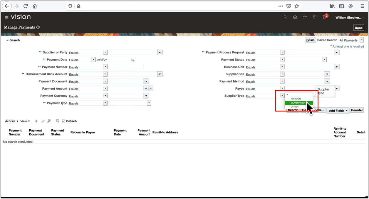 Manage Payments search results showing filtered payment records in Oracle Fusion