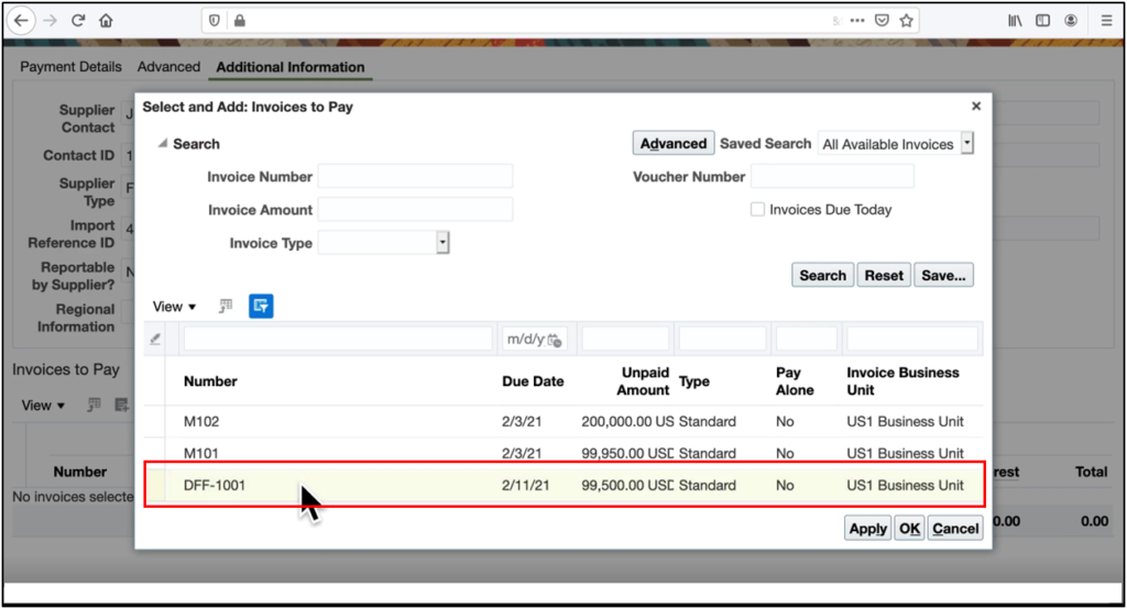 2. Click the task and select Create Payment, then choose the business unit, supplier, and supplier site