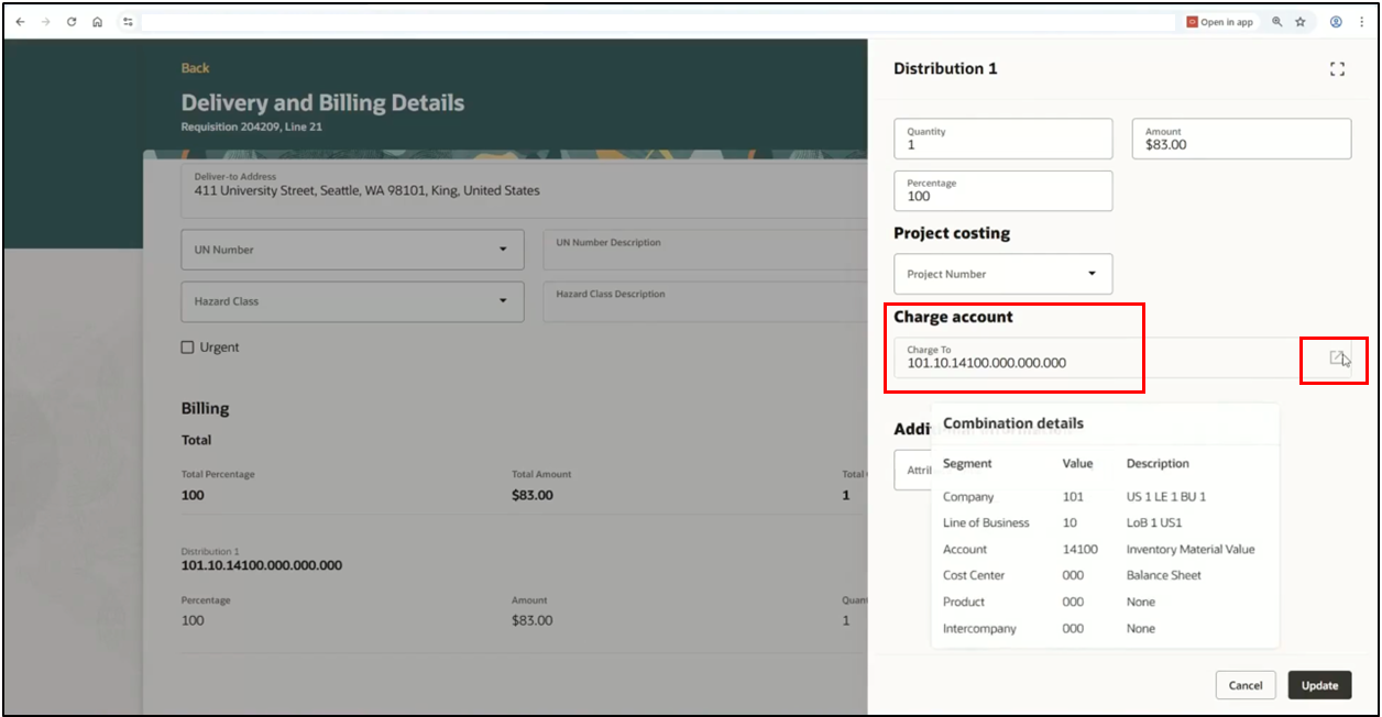 2. Review the requisition line to ensure the Charge Account field is locked, confirming that the business rule has been applied successfully.